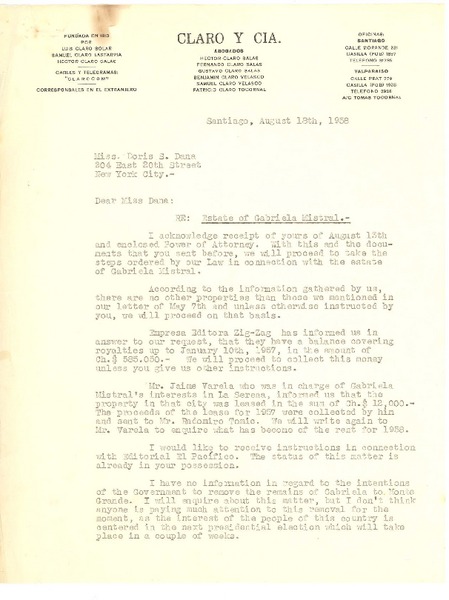 [Carta] 1958 ago. 18, Santiago, Chile [a] Doris Dana, New York [manuscrito] Benjamín Claro V.