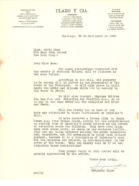 [Carta] 1958 nov. 28, Santiago, Chile [a] Doris Dana, New York [manuscrito] Benjamín Claro V.