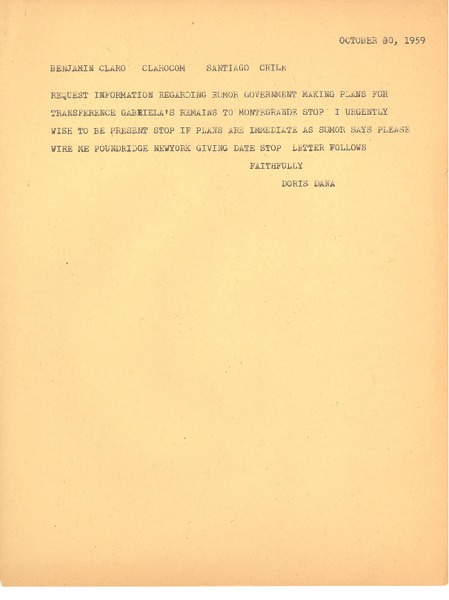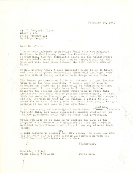 [Carta] 1960 mar. 1, Santiago, Chile [a] Doris Dana, New York [manuscrito] Benjamín Claro V.