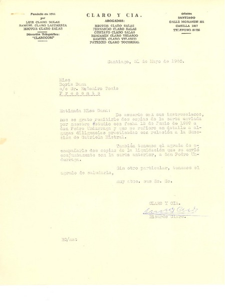 [Carta] 1960 may. 31, Santiago, Chile [a] Doris Dana, New York [manuscrito] Benjamín Claro V.