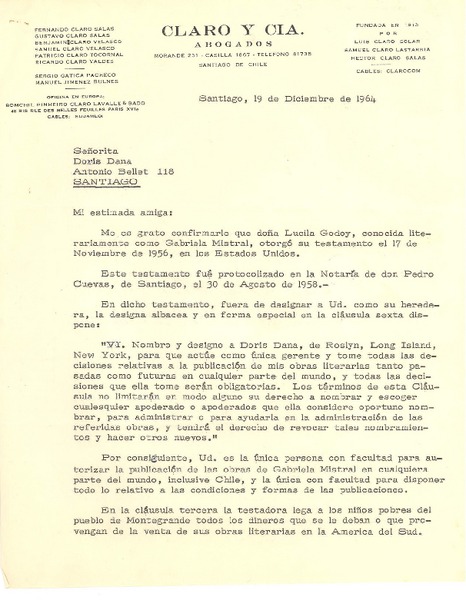 [Carta] 1964 dic. 19, Santiago, Chile [a] Doris Dana, Santiago [manuscrito] Benjamín Claro V.