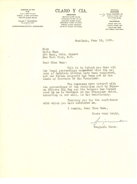 [Carta] 1959 jun. 13, Santiago, Chile [a] Doris Dana, New York [manuscrito] Benjamín Claro V.