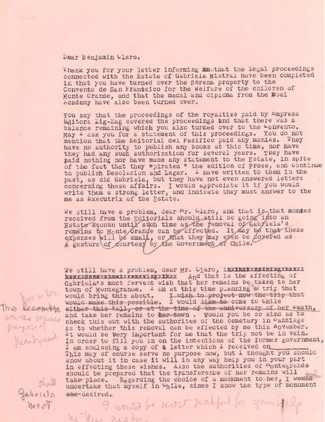 Claro Velasco, Benjamín - Mistral, Gabriela - Correspondencia - Manuscritos chilenos