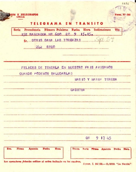 [Telegrama] 1954 sept. 17, Rancagua [a] Doris Dana, Santiago [manuscrito] María Teresa Gacitúa