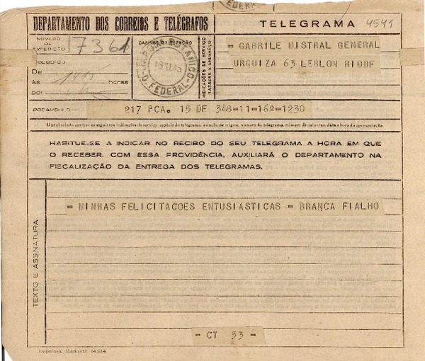 [Telegrama] 1945 nov. 16, [Brasil] [a] Gabrile [i.e. Gabriela] Mistral, Leblon, Rio DF, [Brasil] [manuscrito] Branca Fialho.