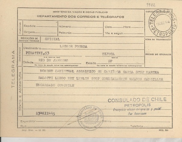 [Telegrama] 1945 dic. 13, Petrópolis, Brasil [a] Leonor Posada, Rio de Janeiro, [Brasil] [manuscrito] [Arturo] Valdés.