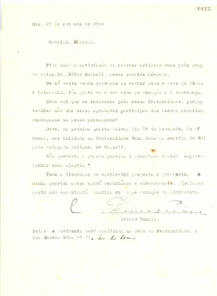 [Carta] 1944 oct. 27, Rio, [Brasil] [a] Gabriela Mistral [manuscrito] Leonor Posada.