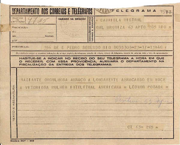 [Telegrama] 1945 nov. 17, Río de Janeiro [a] Gabriela Mistral [manuscrito] Leonor Posada.