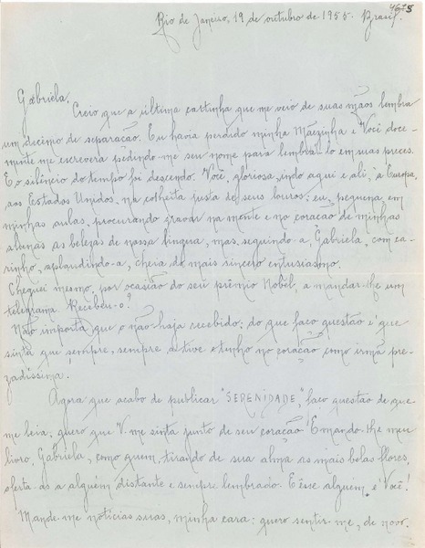 [Carta] 1955 oct. 19, Rio de Janeiro, Brasil [a] Gabriela [Mistral] [manuscrito] Leonor.