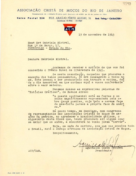 [Carta] 1945 nov. 19, Pôrto Alegre, [Brasil] [a] Gabriela Mistral, Petrópolis [manuscrito] Aguinaldo Costa Pereira.