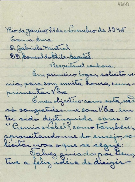 [Carta] 1945 nov. 21, Río de Janeiro [a] Gabriela Mistral [manuscrito] José Augusto Gonçalves.