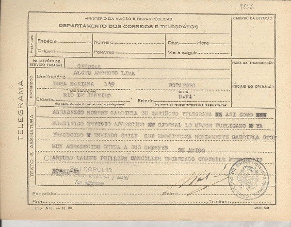 [Telegrama] 1945 nov. 30, Petrópolis, Brasil [a] Alceu Amoroso Lima, Rio de Janeiro, [Brasil] [manuscrito] Arturo Valdés.