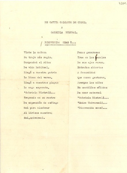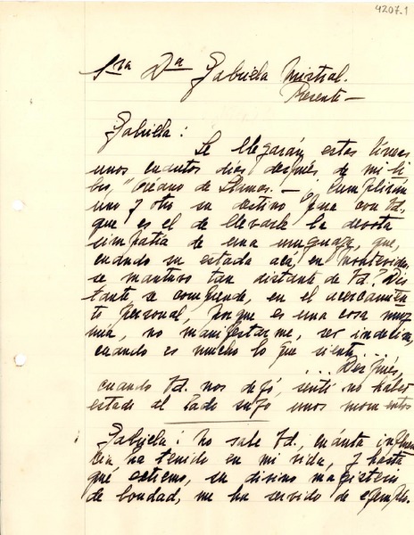 Mistral, Gabriela - Correspondencia - Poetisas uruguayas - Manuscritos uruguayos - Calcagno de Cione, Catita