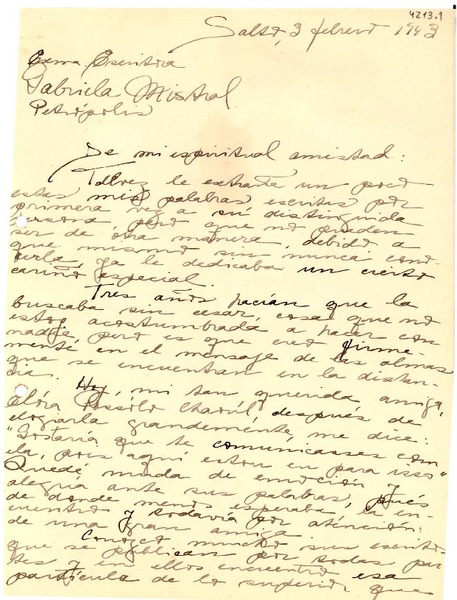 [Carta] 1943 feb. 3, Salto, Uruguay [a] Gabriela Mistral, Petrópolis, [Brasil] [manuscrito] Eunice Tavares.