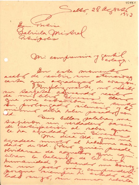 [Carta] 1943 ago. 28, Salto, Uruguay [a] Gabriela Mistral, Petrópolis [manuscrito] Eunice Tavares.