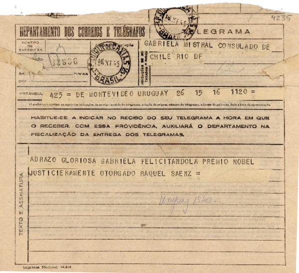 [Telegrama] 1945 nov. 16, Montevideo, Uruguay [a] Gabriela Mistral, Consulado de Chile, Rio DF, [Brasil] [manuscrito] Raquel Saenz.