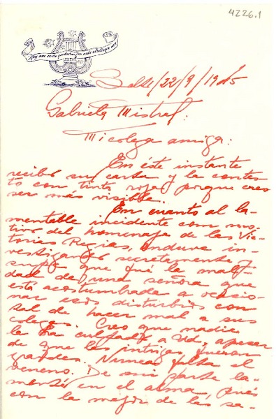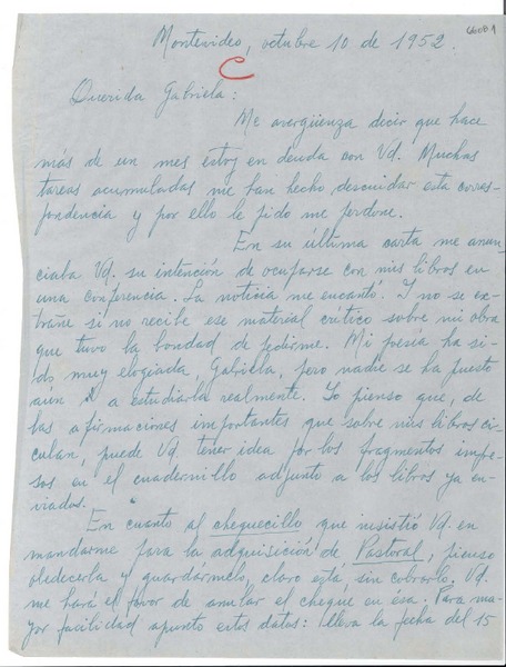 [Carta] 1937 oct. 3, Montevideo [a] Gabriela Mistral [manuscrito] Juana de Ibarbourou.