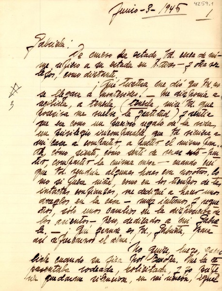 [Carta] 1945 jun. 3, Montevideo, Uruguay [a] Gabriela Mistral [manuscrito] María Teresa Fein.
