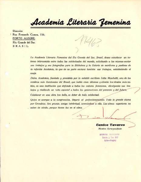 [Carta] [1946], Porto Alegre, Rio Grande del Sur, Brasil [a] Gabriela Mistral [manuscrito] Eunice Tavares.