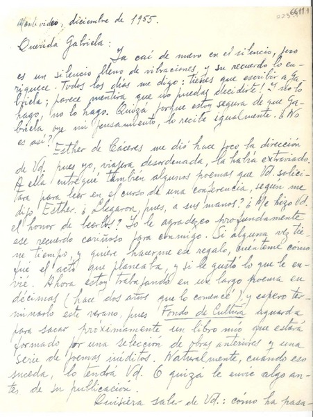 [Carta] 1955 dic., Montevideo [a] Gabriela Mistral [manuscrito] Sara de Ibañez.