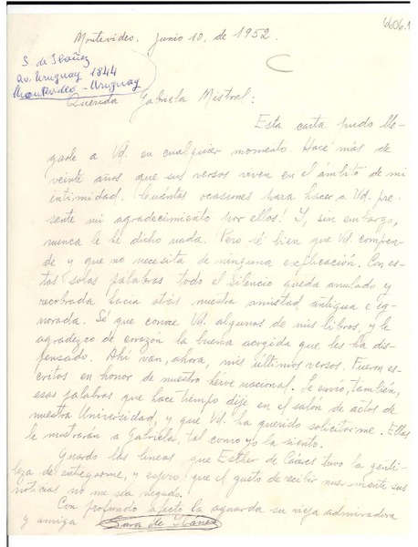 [Carta] 1952 jun. 10, Montevideo, [Uruguay] [a] Gabriela Mistral [manuscrito] Sara de Ibáñez.