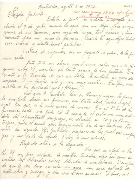 [Carta] 1952 ago. 5, Montevideo, [Uruguay] [a] Gabriela Mistral [manuscrito] Sara de Ibáñez.