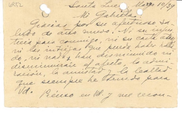 [Tarjeta] 1939 mar. 10, Santa Lucía, [Uruguay] [a] Gabriela [Mistral] [manuscrito] Luisa Luisi.
