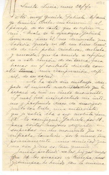 [Carta] 1940 ene. 23, Santa Lucía, Uruguay [a] Gabriela [Mistral] [manuscrito] Luisa [Luisi].