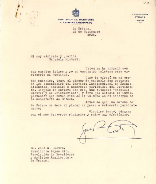 [Carta] 1938 nov. 22, La Habana [a] Gabriela Mistral [manuscrito] José R. Castro.
