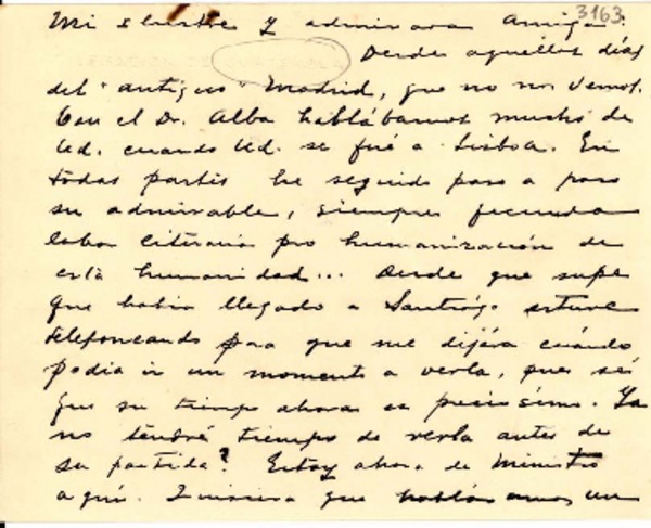 [Tarjeta] 1938 jun. 16, Santiago, [Chile] [a] Gabriela Mistral [manuscrito] Virgilio Rodríguez Beteta.