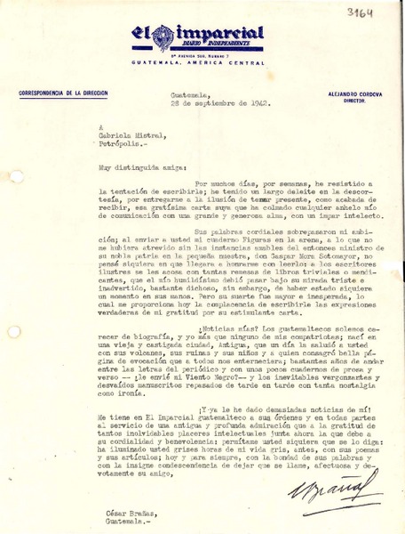 [Carta] 1942 sept. 28, Guatemala [a] Gabriela Mistral, Petrópolis, [Brasil] [manuscrito] César Brañas.