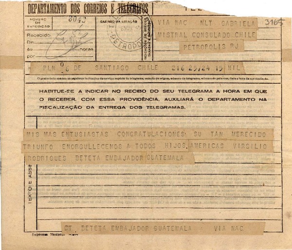 [Telegrama] 1945 nov. 16, Santiago, Chile [a] Gabriela Mistral, Petrópolis, [Brasil] [manuscrito] Virgilio Rodríguez Beteta.