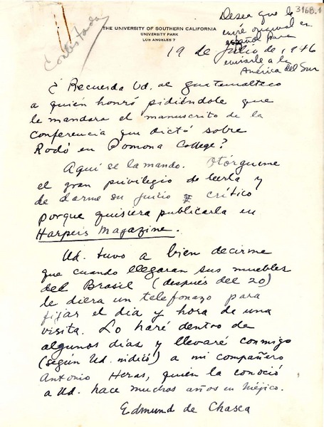 [Carta] 1946 ago. 19, Los Angeles, [Estados Unidos] [a] Gabriela Mistral [manuscrito] Edmund de Chasca.