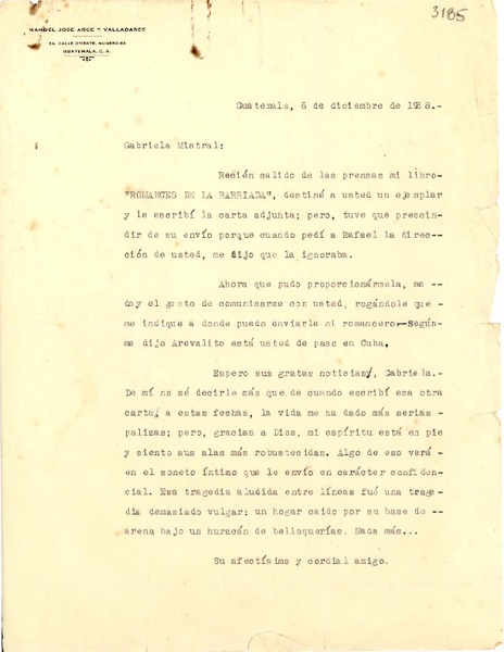 [Carta] 1938 dic. 6, Guatemala [a] Gabriela Mistral [manuscrito] Manuel José Arce y Valladares.