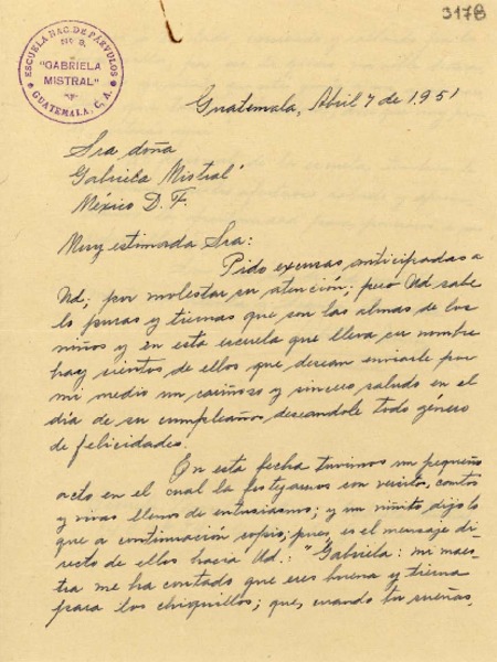 [Carta] 1951 abr. 7, Guatemala [a] Gabriela Mistral, México D.F [manuscrito] Otilia Nuñez.