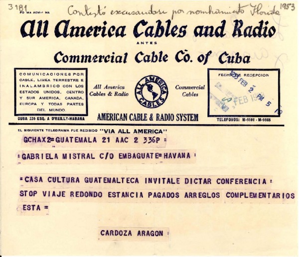 [Telegrama] 1953 feb. 2, Guatemala [a] Gabriela Mistral, La Habana [manuscrito] Cardoza y Aragón.
