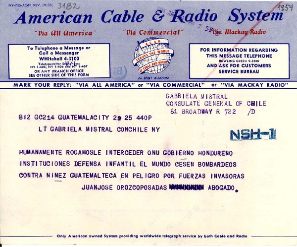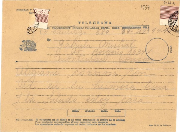 [Telegrama] [1954], [Chile] [a] Gabriela Mistral, Concón [manuscrito] Miguel Ángel Asturias.