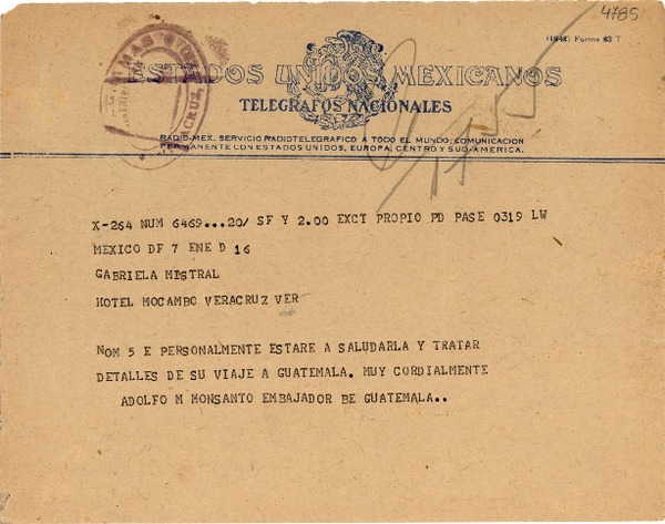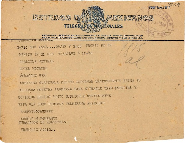 [Telegrama] 1945 feb. 21, México D.F. [a] Gabriela Mistral, Hotel Mocambo, Veracruz [manuscrito] Adolfo M. Monsanto.