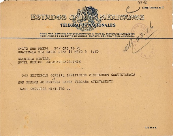 [Telegrama] [1950] mayo 16, Guatemala [a] Gabriela Mistral, Hotel México, Jalapa, Veracruz [manuscrito] Raúl Oseguera.