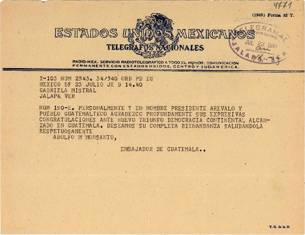 [Telegrama] 1949 jul. 23, México D.F. [a] Gabriela Mistral, Jalapa, Ver[acruz], [México] [manuscrito] Adolfo M. Monsanto.