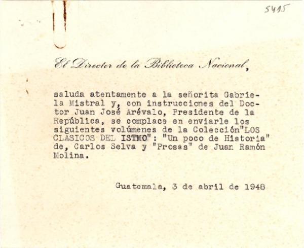 [Tarjeta] 1948 abr. 3, Guatemala [a] Gabriela Mistral [manuscrito] El Director de la Biblioteca Nacional [de Guatemala].