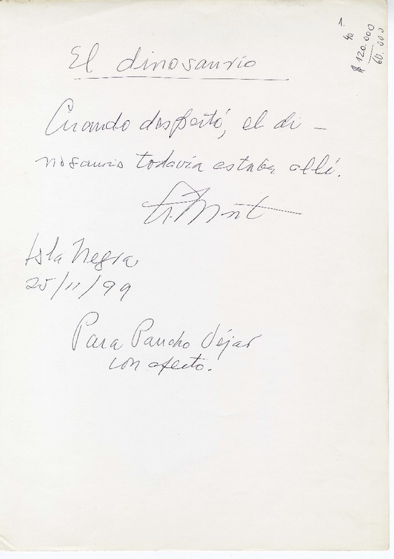 El dinosaurio [manuscrito] Augusto Monterroso.