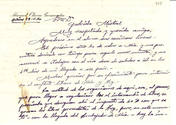 [Carta] 1950 mayo 17, Buenos Aires [a] Gabriela Mistral, [Jalapa, Veracruz, México] [manuscrito] Manuel Olarra Garmendia.