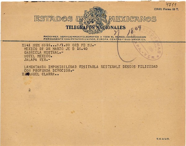 [Telegrama] 1943 sept. 29, B Aires, [Argentina] [a] Gabriela Mistral, Petrópolis, RJ, [Brasil] [manuscrito] Manuel Olarra.
