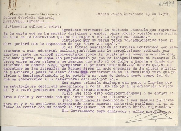 [Carta] 1940 dic. 13, Buenos Aires, [Argentina] [a] Gabriela Mistral, Petrópolis, Brasil [manuscrito] Manuel Olarra Garmendia.