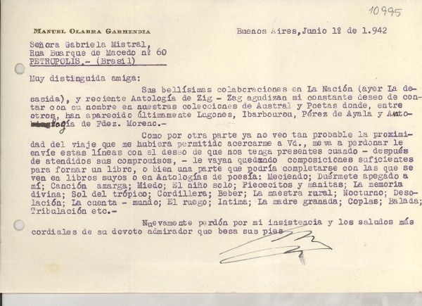 [Carta] 1942 jun. 1, Buenos Aires, [Argentina] [a] Gabriela Mistral, Petrópolis, Brasil [manuscrito] Manuel Olarra Garmendia.