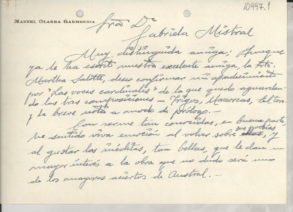 Olarra, Manuel - Correspondencia - Mistral, Gabriela - Manuscritos españoles