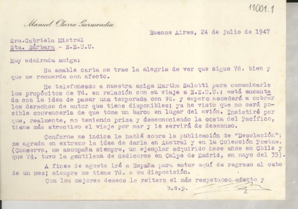 [Carta] 1947 jul. 24, Buenos Aires, [Argentina] [a] Gabriela Mistral, Sta. Bárbara, EE.UU. [manuscrito] Manuel Olarra Garmendia.