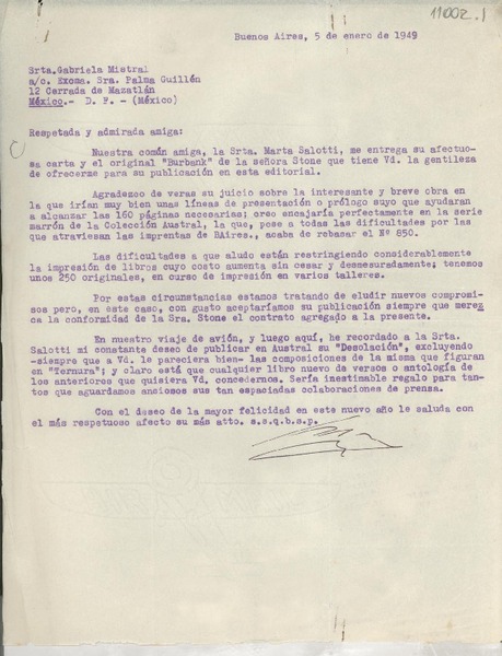 [Carta] 1949 ene. 5, Buenos Aires, [Argentina] [a] Gabriela Mistral, México D.F., México [manuscrito] Manuel Olarra Garmendia.
