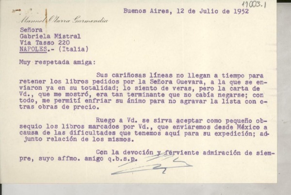 [Carta] 1952 jul. 12, Buenos Aires, [Argentina] [a] Gabriela Mistral, Nápoles, Italia [manuscrito] Manuel Olarra Garmendia.
